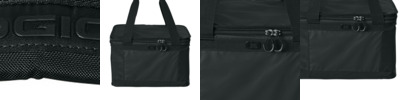 200D poly wave dobby PVC 200D recycled RPET poly mini grid dobby PU Padded wrap handle Interior left and right mesh storage pockets Contrast tipped webbing Zippered front pocket Removable, adjustable padded shoulder strap with black reflective OGIO heat transfer Luggage trolley pass through on back Padded foam bottom for strength Black reflective O icon heat transfer on front Dimensions: 12'h x 21'w x 12'd Capacity: 2,685 cu. in./44 L Weight: 1.43 lbs./0.7 kg Note: Bags not intended for use by children 12 and under.