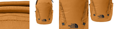 Mid Grey Dark Heather/TNF Black and TNF Black Heather/TNF Blue: 300D 100% recycled polyester heather ripstop canvas with non-PFC durable water-repellent (non-PFC DWR) finish TNF Black and Timber Tan: 600D 100% recycled polyester plain weave with non-PFC durable water-repellent (non-PFC DWR) finish 100% recycled trim FlexVent suspension system Webbing top handles Padded, protective 15' laptop sleeve Front compartment has secure-zip pockets, tablet sleeve and key fob Exterior daisy chains Two exterior pockets Sternum strap with whistle buckle Contrast embroidered The North Face logo on center top Average weight: 1 lb. 11 oz. (770 g) Volume: 1587 in 3 (26 liters) Laptop sleeve: 11.5'h x 11'd Dimensions: 18'h x 11'w x 8'd